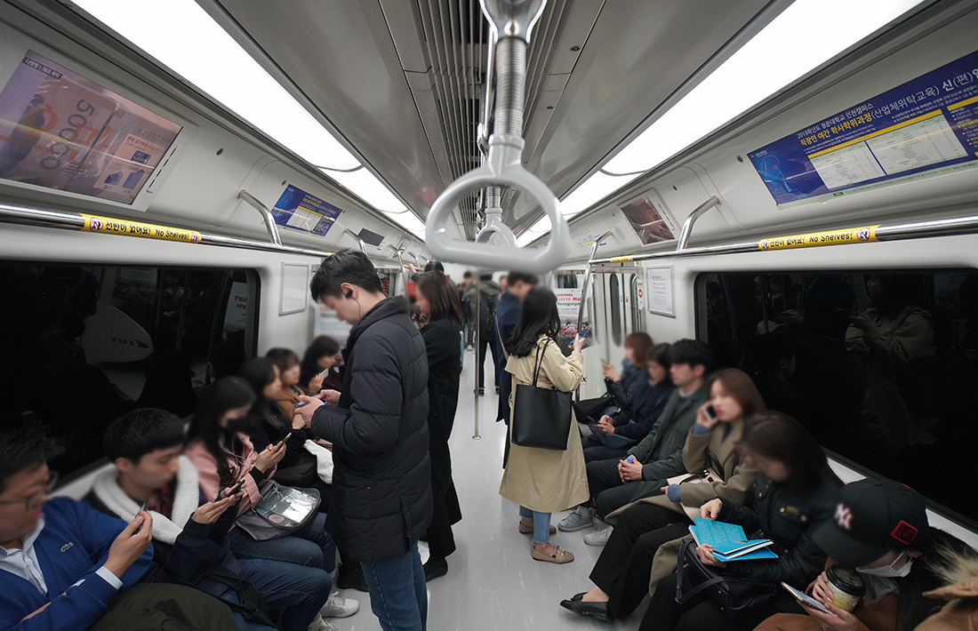 Korean commuters are often glued to their smartphones while riding the subway. © YonhapNews