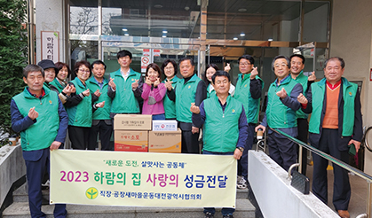 Á÷À塤°øÀå ´ëÀü½ÃÇùÀÇȸ(ȸÀå ¹Ú¿µº¹)´Â Áö³ 3¿ù 24ÀÏ ÁßÁõÀå¾ÖÀÎ ¿ä¾ç½Ã¼³ÀÎ ¡®Ç϶÷ÀÇ Áý¡¯À» ¹æ¹®ÇØ ±×µ¿¾È ȸ¿øµéÀÌ ½Ê½ÃÀÏ¹Ý ¸ð¾Æ¿Â 100¸¸ ¿ø »ó´çÀÇ ¼º±ÝǰÀ» Àü´ÞÇß´Ù. Á÷À塤°øÀå ´ëÀü½ÃÇùÀÇȸ´Â ¸Å³â Áö¿ª ³» Àå¾ÖÀÎ º¹Áö½Ã¼³À» Áö¼ÓÀûÀ¸·Î ¹æ¹®ÇØ ºÀ»çȰµ¿°ú ¼º±Ýǰ Àü´Þ µî ÀÌ¿ô»ç¶ûÀ» ½ÇõÇϰí ÀÖ´Ù.