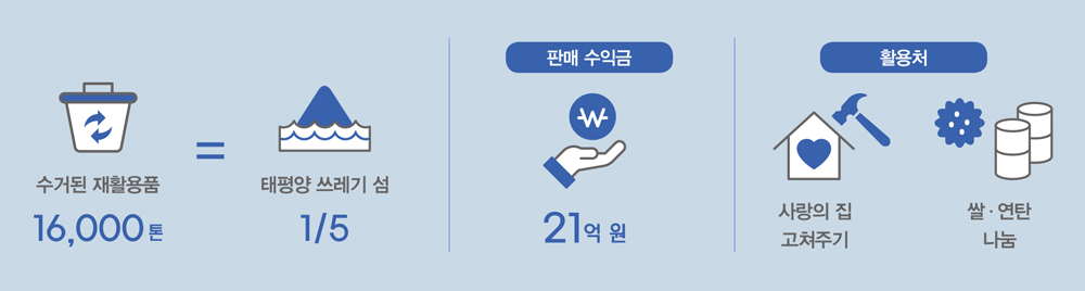 ÀçȰ¿ëǰ °æÁø´ëȸ Çà»ç¸¦ ÅëÇØ Áö³ 22³â°£ ¼ö°ÅµÈ ÀçȰ¿ëǰÀÇ ¾çÀº 16,000Åæ, ÀçȰ¿ëǰ ÆÇ¸Å ¼öÀͱÝÀº 21¾ï ¿ø¿¡ ´ÞÇϸç, ¸Å³â 10¿© °¡±¸ ºÒ¿ì ÀÌ¿ôÀ» ´ë»óÀ¸·Î »ç¶ûÀÇ Áý °íÃÄÁֱ⠻ç¾÷, ¼Ò¿Ü°èÃþÀ» À§ÇÑ ½Ò, ¿¬Åº µî »ýÇÊǰ ³ª´® µî ´Ù¾çÇÑ È°µ¿¿¡ »ç¿ëµÇ°í ÀÖ´Ù.