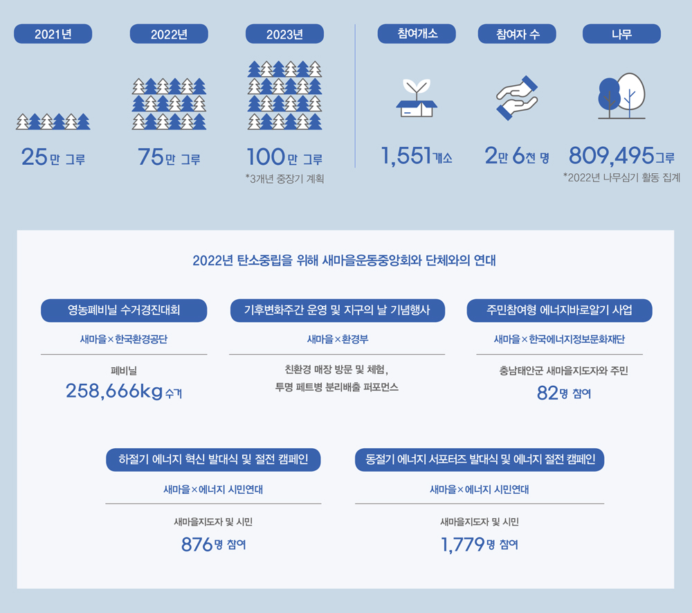 »õ¸¶À»¿îµ¿Áß¾Óȸ´Â ź¼ÒÁ߸³»çȸ·ÎÀÇ ÀüȯÀ» À§ÇØ »ê¸²Ã»°ú ÇÔ²² ¡®Àü±¹ 75¸¸ ±×·ç ³ª¹«½É±â¡¯¸¦ ÁøÇàÇß´Ù. 2021³â 25¸¸ ±×·ç, 2022³â 75¸¸ ±×·ç, 2023³â 100¸¸ ±×·ç ³ª¹«½É±â 3°³³â ÁßÀå±â °èȹÀ» ÅëÇØ ¡®2050³â ź¼ÒÁ߸³ ½ÇÇö ¹ü±¹¹Î ³ª¹« ½É±â ¿îµ¿¡¯À» ÆîÄ¡¸ç ź¼ÒÁ߸³»çȸ ¸¸µé±â¿¡ ¾ÕÀå¼°í ÀÖ´Ù.